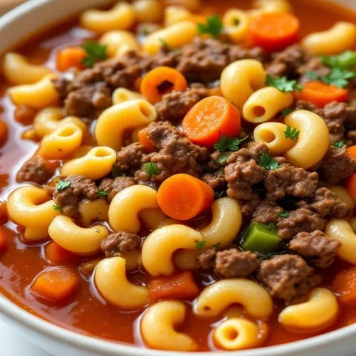 A hearty and comforting beef and macaroni soup made with tender ground beef, elbow pasta, veggies, and a flavorful tomato broth. A cozy one-pot meal!