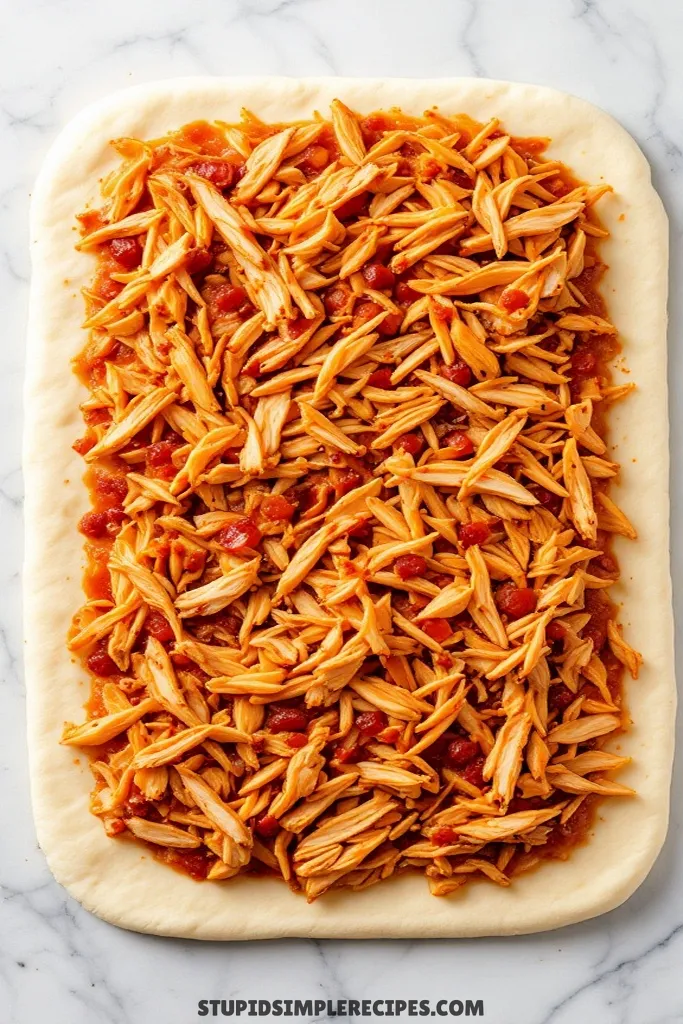 - Spread your BBQ chicken mixture evenly over the dough, leaving about a 1-inch border around the edges. This border helps seal everything in when we roll it up.