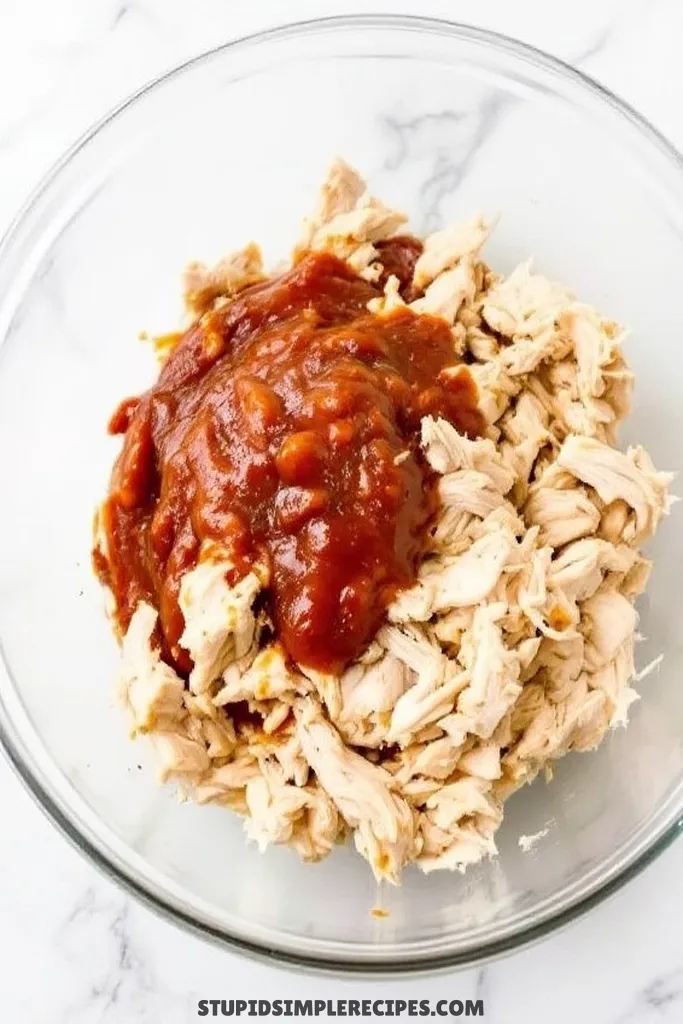 2. In a mixing bowl, combine the shredded chicken with about 3/4 cup of the BBQ sauce. You want the chicken well-coated but not swimming in sauce. Keep that extra 1/4 cup of sauce for later – we’ll use it for drizzling.