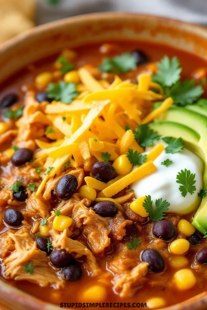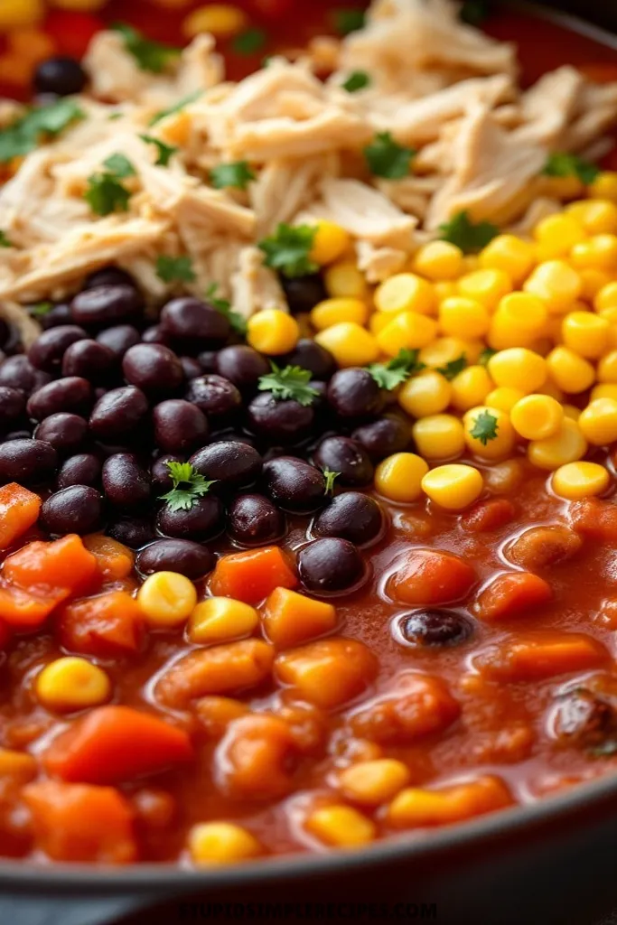 - Add shredded chicken, black beans, and frozen corn. Simmer for 15-20 minutes, stirring occasionally, to allow the flavors to meld and the soup to thicken slightly.