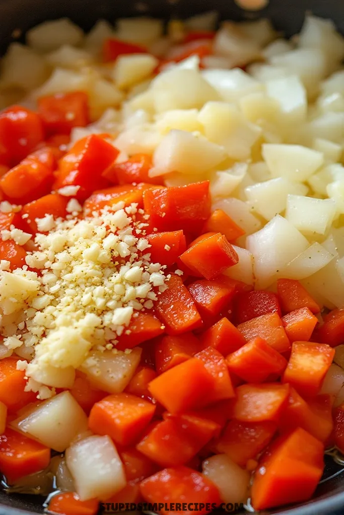 2. Toss in the minced garlic and diced bell pepper. I like to add these together because the garlic can burn if it goes in too early. Cook for another 2-3 minutes until you can really smell the garlic and the peppers start to soften. You’ll know they’re ready when the peppers lose their raw, crisp look and become slightly darker in color.