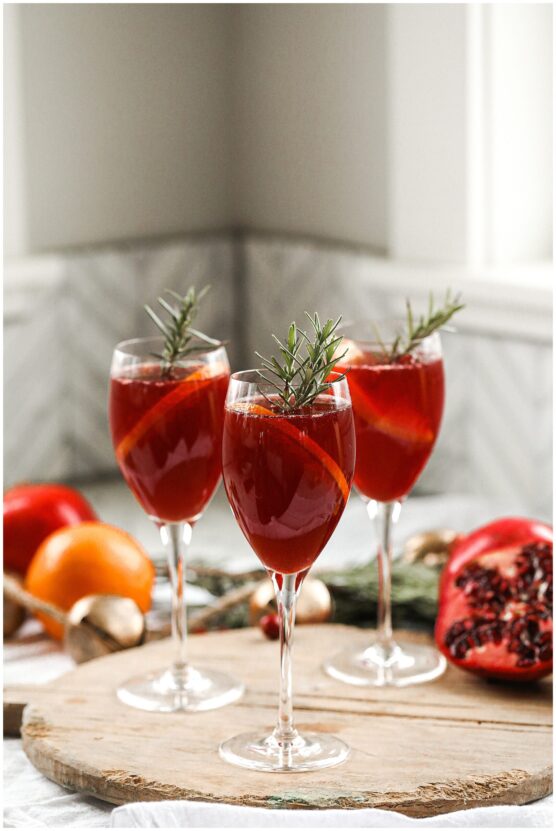 Elegant and simple, this cocktail combines sparkling champagne with jewel-toned pomegranate juice and seeds. The pomegranate adds beautiful color and a hint of tartness that complements champagne’s bubbles perfectly. It’s light, refreshing, and feels incredibly celebratory – ideal for toasting at Christmas dinner or New Year’s Eve.
