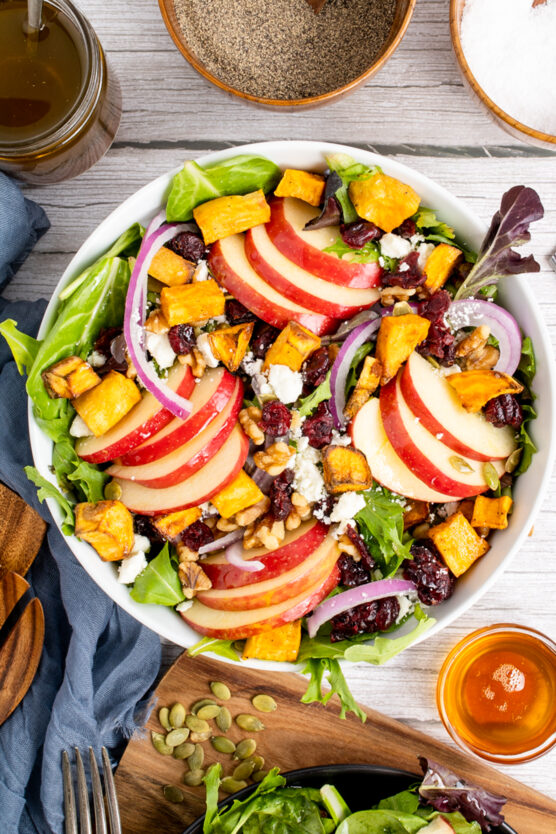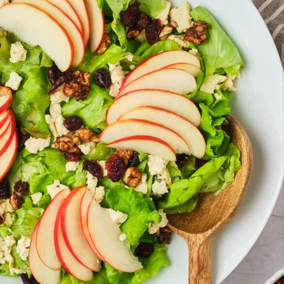 Crisp apple slices and crunchy walnuts create a classic combination that tastes like autumn and winter combined. The maple vinaigrette adds just the right amount of sweetness to complement the tart apples. This salad comes together incredibly quickly and uses simple, accessible ingredients.