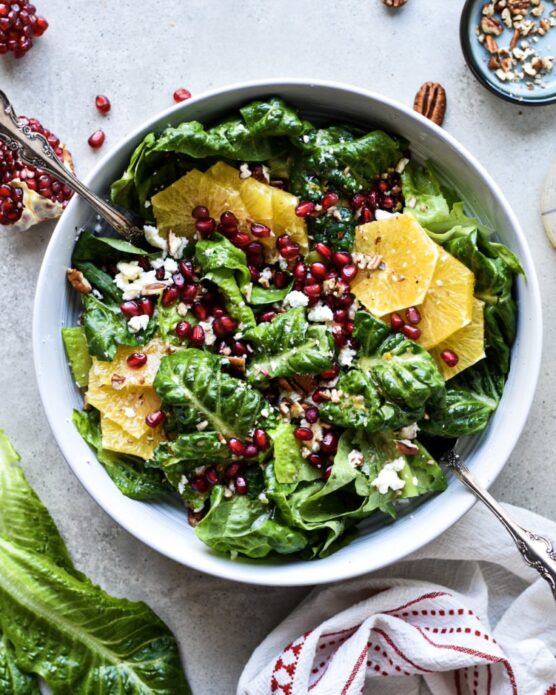 Pecans bring wonderful crunch and richness without weighing down the salad. This is incredibly easy to throw together and looks absolutely stunning on your Christmas table with its red and green colors.