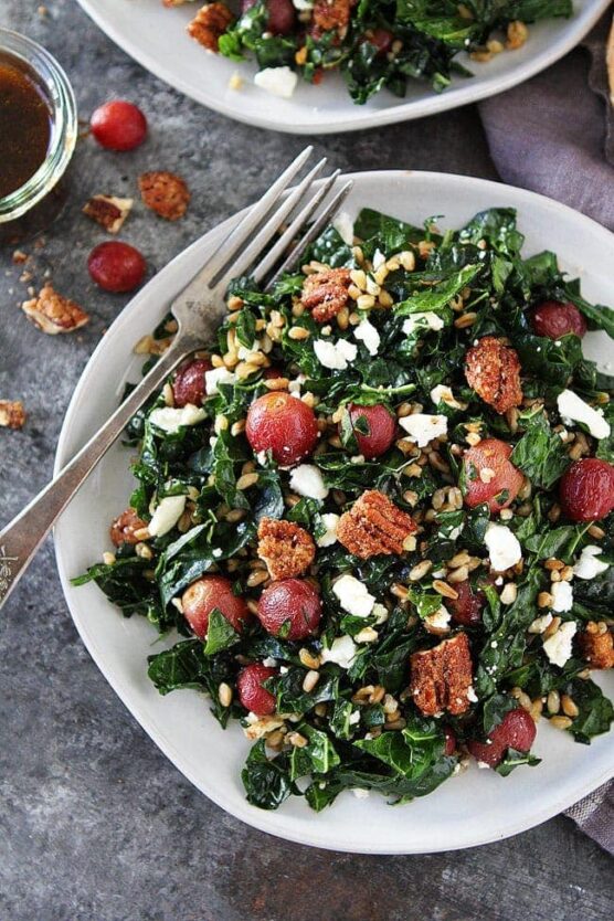Roasting grapes concentrates their sweetness and creates an unexpected, delicious salad component paired with nutty farro. The roasted grapes become jammy and intensely sweet, almost like candy. Farro adds wonderful chewy texture and makes the salad hearty and filling. This is more involved than simple salads but the unique flavors are worth it.