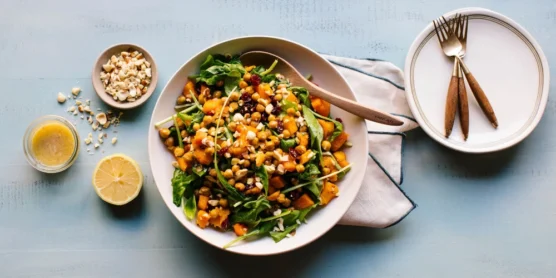 Sweet roasted butternut squash cubes contrast beautifully with peppery arugula in this warming winter salad. The squash can be roasted ahead of time and added warm or at room temperature, making party prep much easier. The natural sweetness of butternut squash pairs wonderfully with tangy vinaigrette and the slight bitterness of arugula.