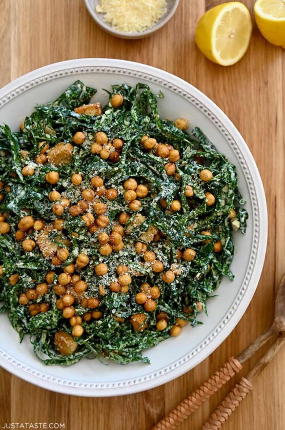 Sturdy kale replaces romaine in this twist on Caesar salad, while crispy chickpeas add protein and crunch. The kale holds up beautifully to the creamy Caesar dressing without wilting. Crispy roasted chickpeas provide satisfying crunch and make the salad more filling. This is hearty enough to be a light lunch but still works as a side dish.