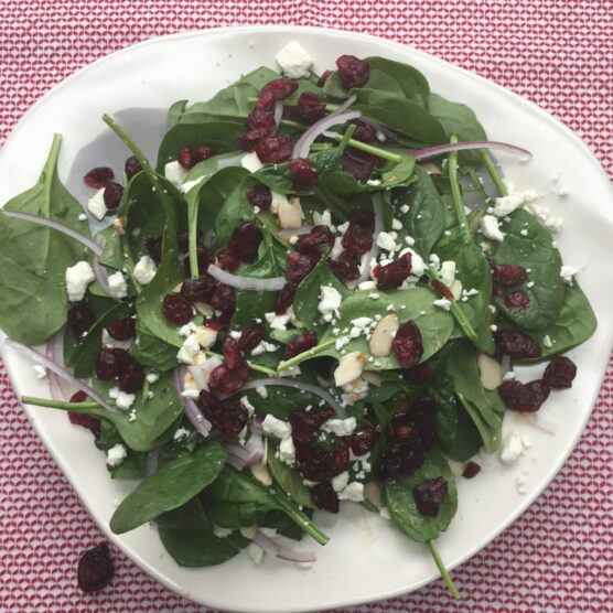 Fresh spinach gets topped with dried cranberries, and crumbled feta, for a perfectly balanced holiday salad. The cranberries provide festive color and chewy sweetness while feta adds salty creaminess. The balsamic glaze ties everything together with its sweet-tart flavor. This is super simple to throw together using mostly pantry ingredients.