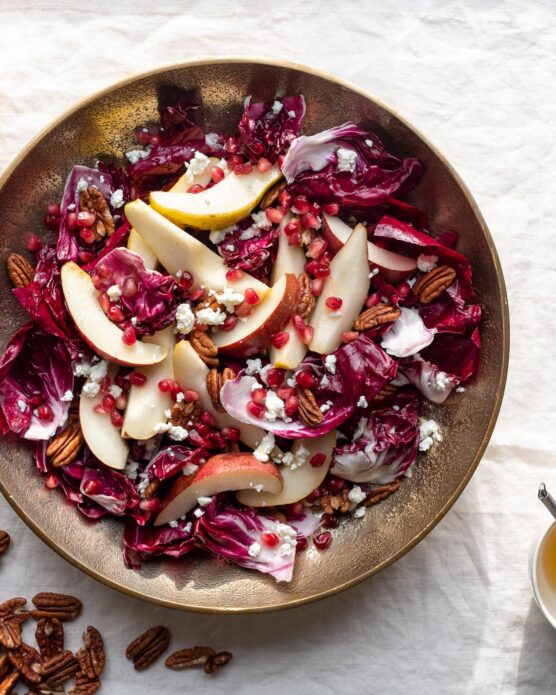 Bitter radicchio gets balanced by sweet pears in this beautiful purple and white salad. The radicchio’s bold flavor is mellowed by sweet fruit and rich dressing. The purple leaves look absolutely stunning on a holiday table and add visual interest. This is fairly simple to make though radicchio can be slightly bitter for some palates.