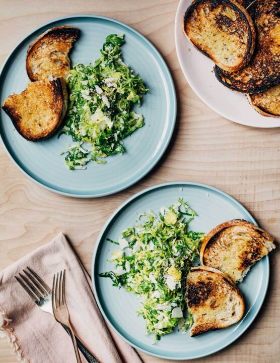 A mandoline makes quick work of shaving the sprouts, though a sharp knife works too. This is great for people who think they don’t like Brussels sprouts – the raw version is completely different from cooked. It’s elegant, crunchy, and stays fresh for hours without wilting.