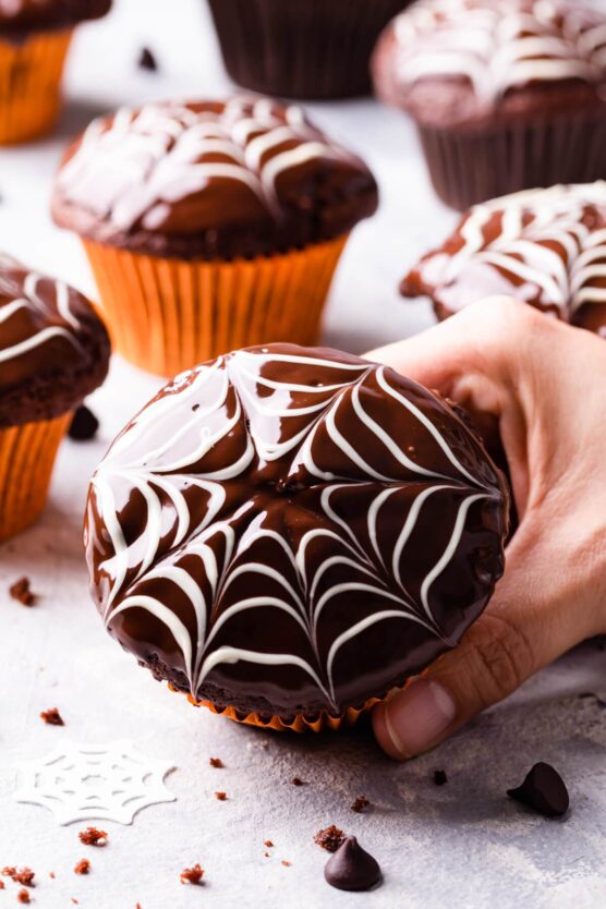 This dramatic dessert features rich dark chocolate fudge muffin topped with intricate white chocolate spider web designs that look professionally made but are surprisingly simple to create. The bitter-sweet chocolate base provides a sophisticated flavor that’s not too sugary, making it perfect for adult Halloween parties. The spider web design is easier than it looks – just drizzle white chocolate in concentric circles and drag a toothpick through them. It’s guaranteed to be a showstopper on your dessert table. Find the recipe here.
