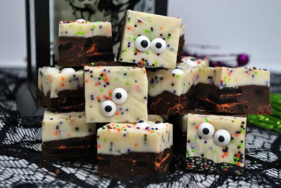 This playful fudge gets its spooky factor from candy “eyeballs” pressed into the surface, creating a creepy-cute treat that kids absolutely love. The vanilla base is smooth and creamy with a classic sweet flavor that appeals to everyone, while the googly candy eyes make it perfectly themed for Halloween. It’s one of the easiest fudge recipes to make, and decorating with the candy eyes is so simple that kids can help. The combination of familiar flavors and fun appearance makes it a guaranteed hit. Find the recipe here.
