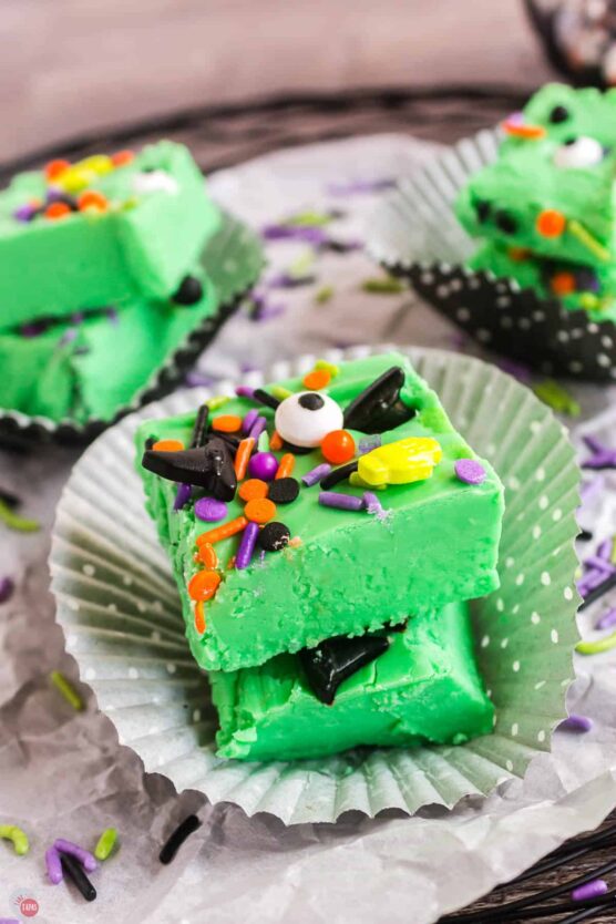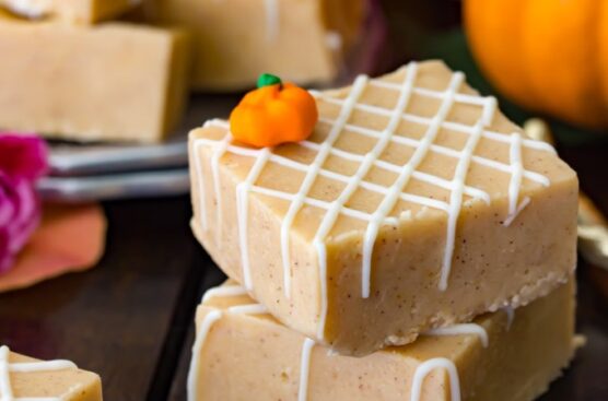 Capturing the essence of classic fall carnival treats, this fudge combines sweet caramel with tart apple flavors in a smooth, creamy base. The apple pieces add delightful texture while the caramel creates rich, buttery notes that complement the fruit perfectly. It requires a bit more technique than basic fudge since you’re working with caramel, but the results are absolutely worth the extra effort. The flavor combination screams autumn and the golden color fits beautifully with Halloween’s warm color palette. Find the recipe here.