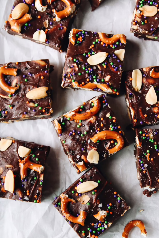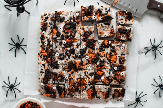 Combining the beloved flavor of cookies and cream with rich chocolate fudge, this dessert features crushed Oreos throughout and can be decorated to look like a spooky graveyard scene. The contrast between the smooth fudge and crunchy cookie pieces creates an amazing texture that’s absolutely irresistible. It’s super simple to make since you’re essentially just folding crushed cookies into your fudge base. Kids especially love this one because it tastes like their favorite cookies in fudge form. Find the recipe here.