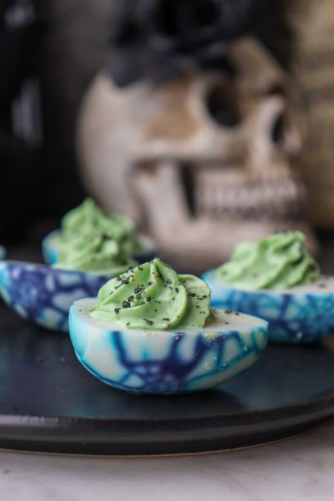 Turn classic deviled eggs into spooky Halloween treats with a few creative touches. These crowd-pleasing appetizers get a seasonal makeover using food coloring to create eerie orange or black yolks, while paprika adds a devilish red dust effect. Garnish with olive “spider” toppings or chive “grass” sprouting from “graveyard dirt” for extra Halloween flair. The familiar creamy texture and tangy flavor remain unchanged, making them perfect for both kids and adults at your Halloween party.