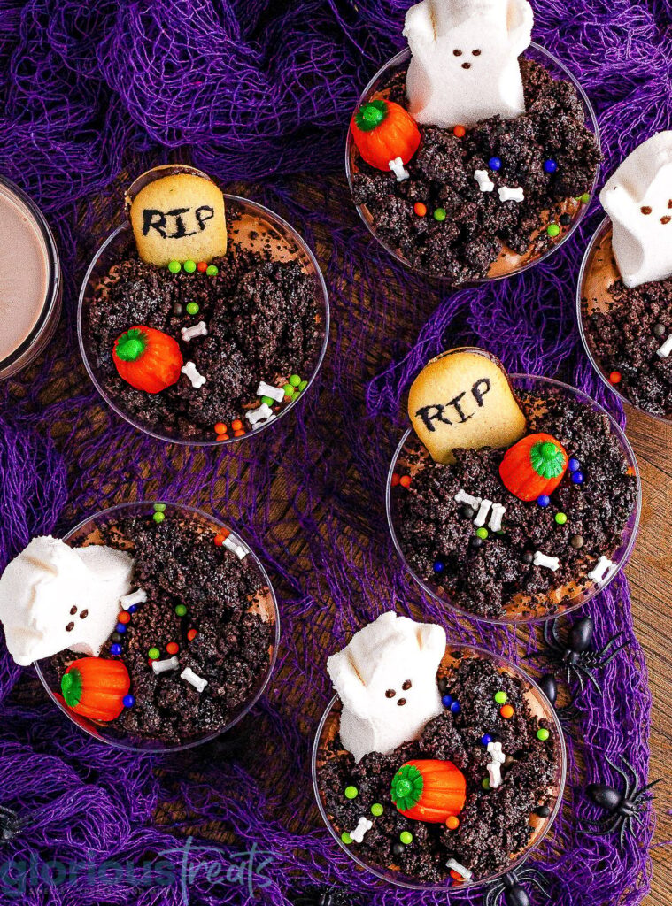 Topped with crumbled cookie “soil” and decorated with candy tombstones, gummy worms, or plastic skeleton hands emerging from the “ground,” they create an eerily delicious graveyard scene. Easy to assemble and endlessly customizable with different spooky decorations, these cups delight both kids and adults with their playful Halloween theme.
