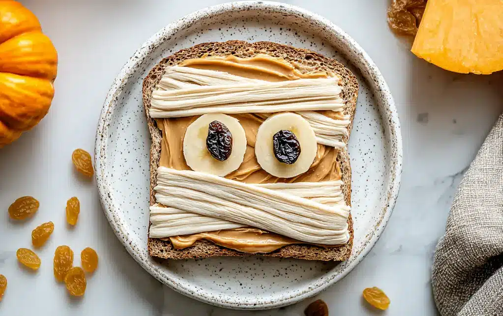 Turn regular toast into adorable mummies using strips of cream cheese as “bandages.” The tangy cream cheese balances perfectly with toasted bread, creating a simple yet satisfying flavor combination. This is incredibly kid-friendly since little ones can help spread the cream cheese strips and place the olive or raisin eyes. It takes just minutes to assemble and uses ingredients you probably already have in your fridge, making it perfect for last-minute Halloween breakfast needs.