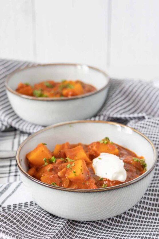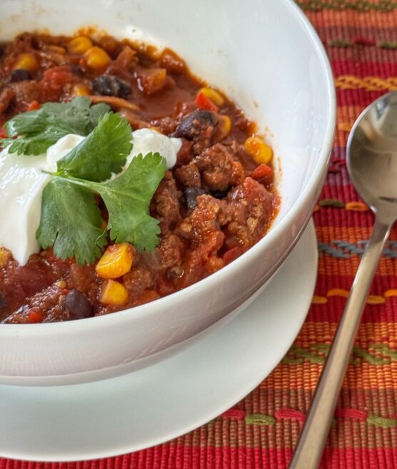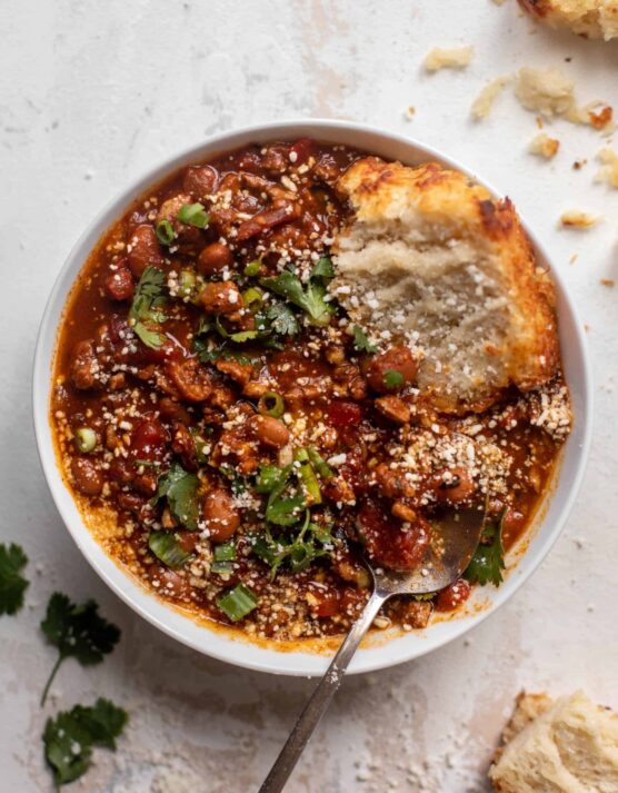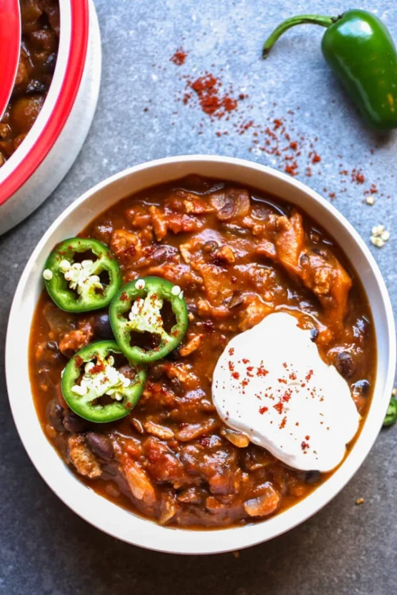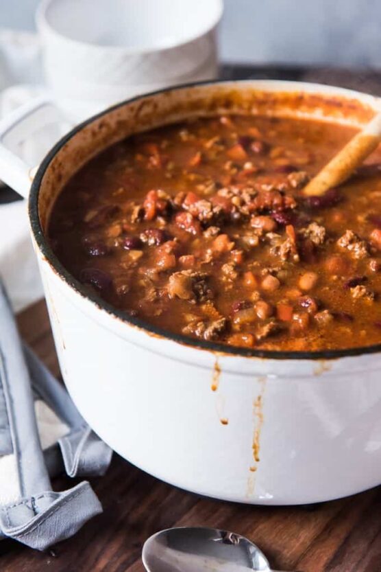 This chili brings the heat with smoky chipotle peppers that add both spice and incredible depth of flavor. The smokiness pairs beautifully with ground beef and creates a complex, restaurant-quality taste at home. It’s not overwhelmingly spicy – just perfectly balanced with a lingering warmth that keeps you coming back for more. The rich, dark color and bold flavor make it perfect for Halloween’s devilish theme. Find the recipe here.