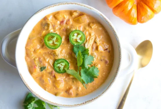 Creamy and comforting, this white chili gets its seasonal twist from pumpkin puree and warm spices like cumin and chili powder. The chicken stays tender and flavorful, while white beans add heartiness without overwhelming the delicate pumpkin flavor. It’s surprisingly elegant for a casual dish, making it great for dinner parties. The one-pot preparation keeps cleanup minimal, which is always a win during busy holiday season. Find the recipe here.