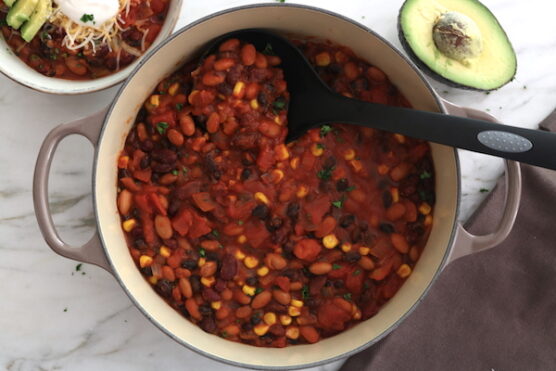 This classic combination of kidney, black, and pinto beans creates a protein-packed vegetarian option that even meat-lovers will enjoy. The variety of beans provides different textures and flavors, making every bite interesting. It’s extremely budget-friendly and makes a huge batch, perfect for feeding a crowd at Halloween gatherings. The recipe is forgiving and easy to customize with whatever vegetables you have on hand. Find the recipe here.