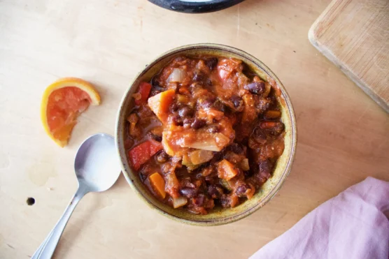 Dark and mysterious, this vegetarian chili gets its dramatic appearance from black beans and a hint of cocoa powder. The combination creates an earthy, complex flavor that’s both hearty and satisfying without any meat. It’s surprisingly quick to throw together on busy weeknights, and kids love the spooky presentation. The beans provide plenty of protein and fiber, making it a nutritious choice for the whole family. Find the recipe here.