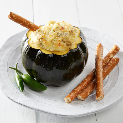 Hot spinach dip gets a Halloween makeover with sour cream piped in concentric circles and dragged with a toothpick to create spiderweb patterns. The familiar flavors of spinach, cheese, and garlic remain unchanged – because this classic dip doesn’t need improving.