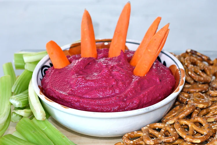 This vibrant red hummus looks appropriately gory while tasting fresh and earthy. Roasted beets add natural sweetness and stunning color to classic hummus flavors. Serve with cut vegetables arranged to look like fingers – carrots, bell pepper strips, and cucumber spears work perfectly.