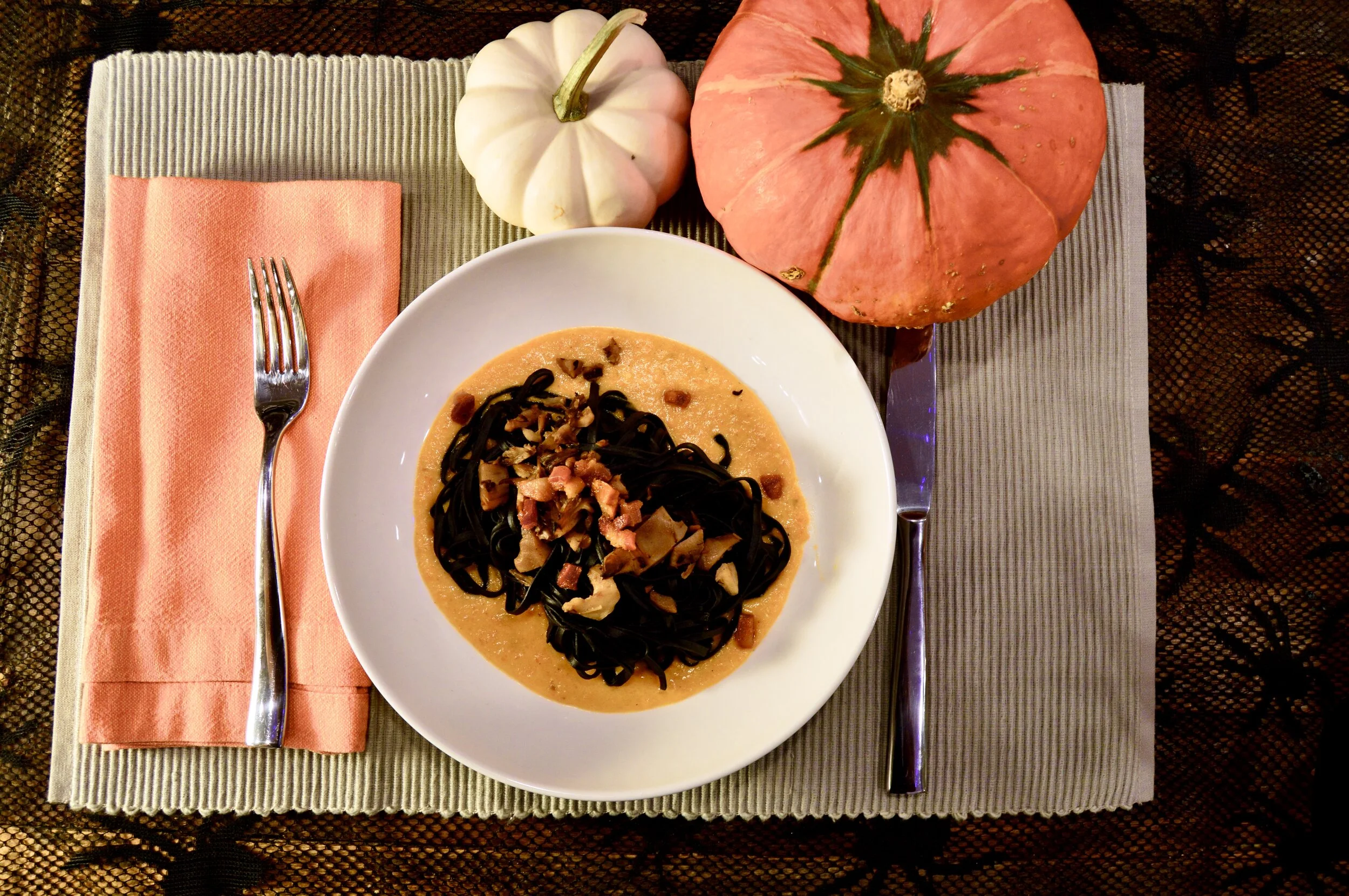 Squid ink pasta creates a dramatic black backdrop for bright orange alfredo sauce made with pureed butternut squash or pumpkin. The colors are stunning, but the flavors are what really shine – creamy, rich, and subtly sweet.