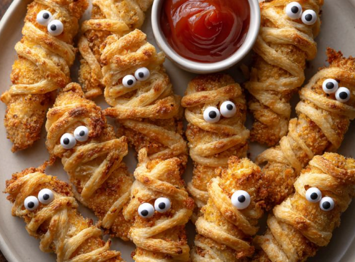 Chicken breasts wrapped in strips of puff pastry or phyllo dough create convincing mummy bandages while keeping the meat incredibly moist. The pastry adds buttery richness and appealing texture contrast to tender chicken.