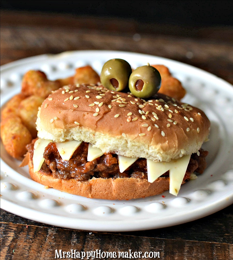Classic sloppy joes get a Halloween makeover when served on hamburger buns, which are easier to find during October. The familiar sweet and tangy flavors remain unchanged – because sloppy joes are perfect as they are. They’re incredibly easy to make and kids absolutely love them, making this ideal for busy Halloween nights.