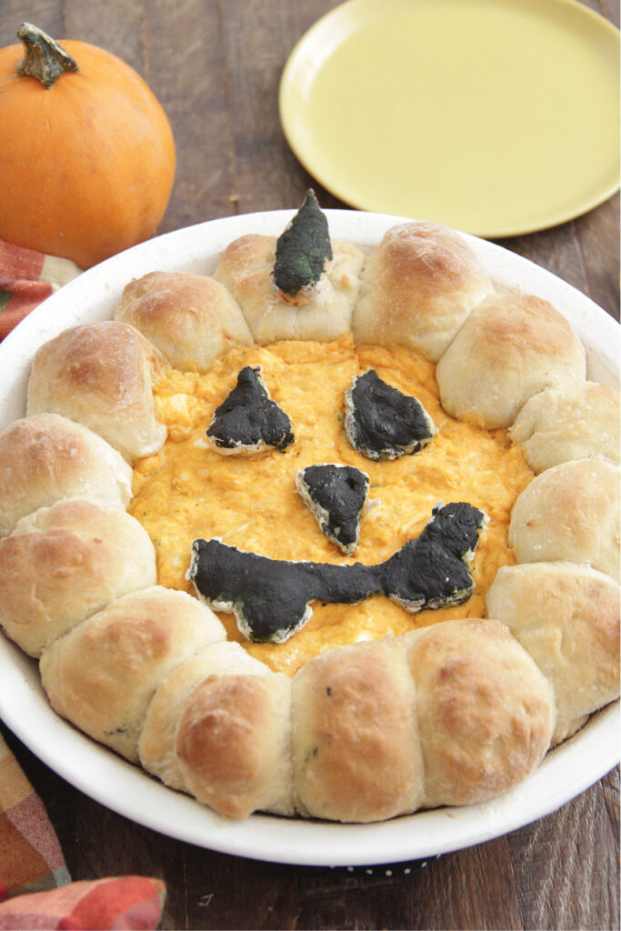 This spooky take on the classic Mexican seven-layer dip gets decorated to look like a miniature graveyard, complete with tortilla chip “tombstones” and olive “dirt.” All the traditional flavors are there – beans, guac, sour cream, cheese, and more – but the presentation makes it Halloween party-ready. It’s perfect for feeding a crowd and can be assembled hours ahead. The layers create beautiful contrast, and each bite gives you a perfect combination of all the flavors and textures.