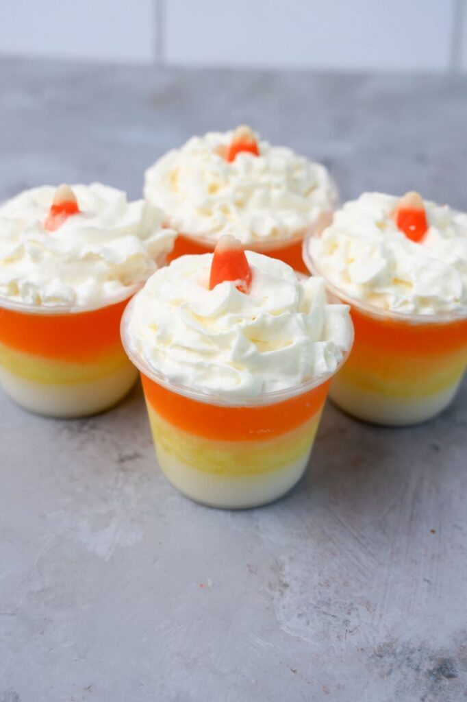 Three distinct layers – yellow, orange, and white – recreate the iconic candy corn appearance in jello shot form. Each layer has its own flavor profile, typically pineapple, orange, and vanilla or coconut. These require more patience than single-layer shots since each layer needs to set before adding the next, but the visual payoff is incredible. They taste like a fruit medley and look absolutely stunning at Halloween parties. The technique isn’t difficult, just time-consuming, making them perfect for advance preparation.
