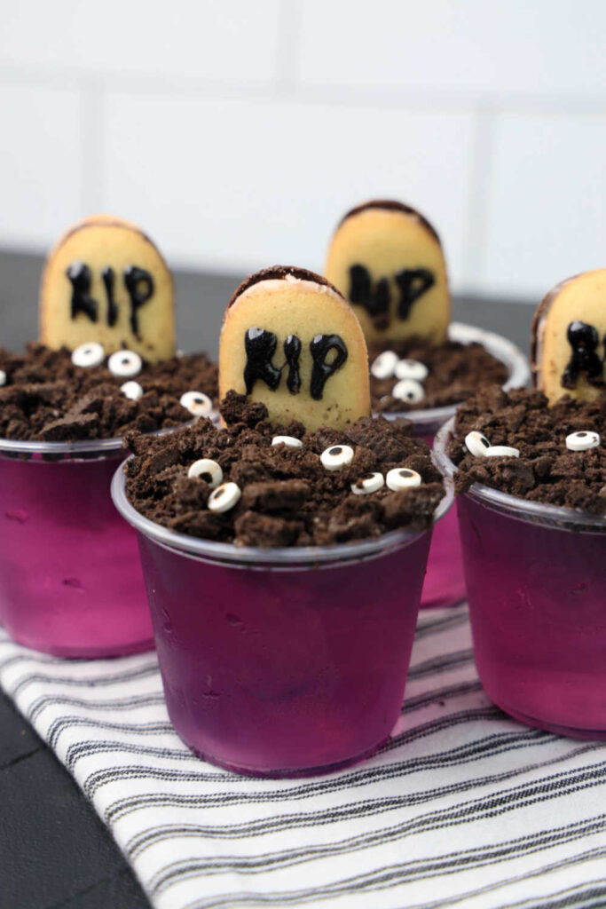 Create spooky layered Jello shots perfect for adult Halloween parties using dark purple or black Jello as the base “dirt” layer. Add vodka or rum to gelatin mixture following package directions but substituting alcohol for cold water. Pour into clear plastic cups, refrigerate until set, then top with crushed chocolate cookies for graveyard soil. Insert Milano cookie “tombstones” decorated with edible markers, and add gummy worms crawling from the “graves.” Garnish with candy bones or skeleton picks for extra flair. These boozy treats combine nostalgia with grown-up fun for memorable Halloween entertaining.