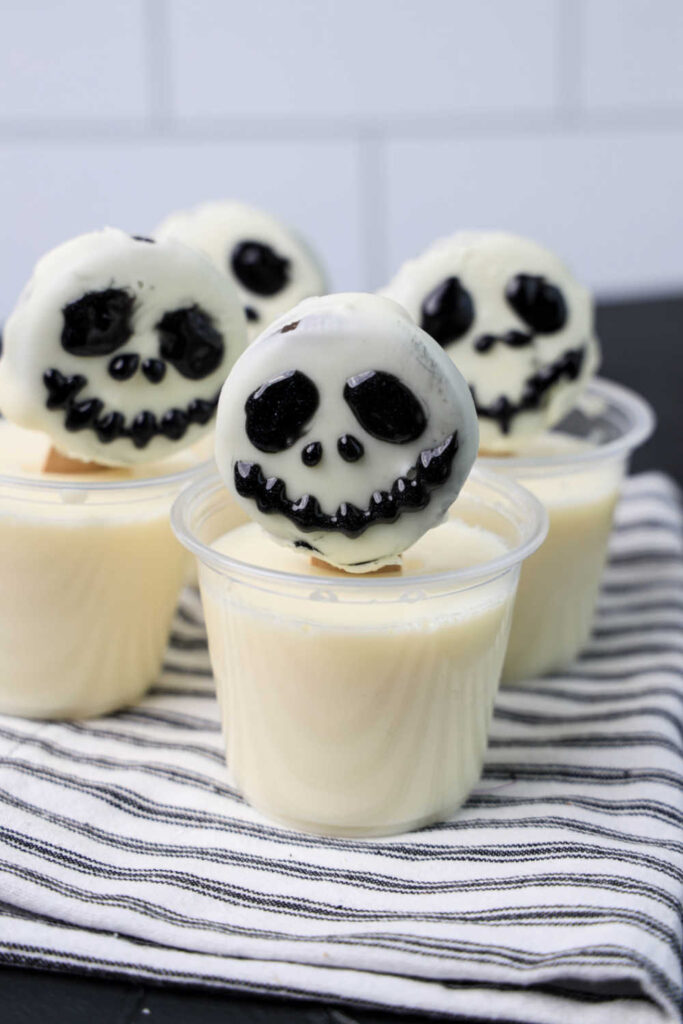 These spooky Jello shots capture Jack Skellington’s iconic look with a striking black and white layered design. Made with vodka or rum-infused gelatin, they feature a dark base layer topped with white, then decorated with edible markers or icing to create Jack’s distinctive face—hollow eyes, stitched smile, and bat bow tie. Perfect for adult Halloween parties, these boozy treats combine playful presentation with festive flavor. Serve chilled in small cups for easy handling, and watch guests delight in these drinkable tributes to the Pumpkin King himself.