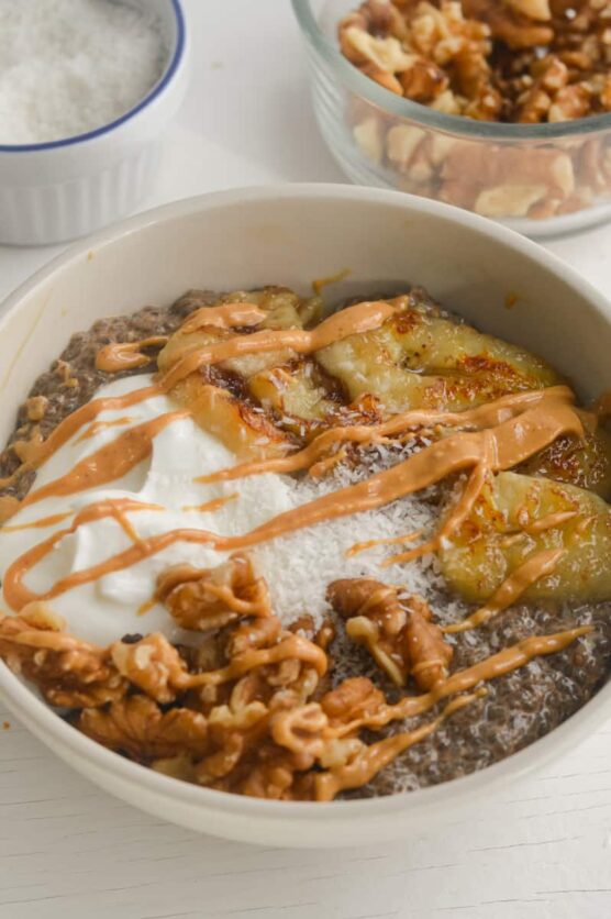This make-ahead pudding transforms tiny chia seeds into a creamy, pudding-like texture that’s packed with omega-3s and fiber. Winter spices like cinnamon, nutmeg, and ginger make it taste festive and warming. It’s ridiculously easy – just mix and refrigerate overnight.