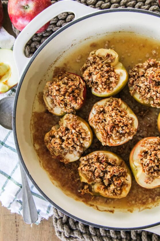 Whole apples get cored, stuffed with oats and nuts, then baked with a maple glaze until tender. The apples become incredibly soft and naturally sweet, while the filling adds texture and substance. The maple glaze creates a beautiful caramelized coating that tastes indulgent.