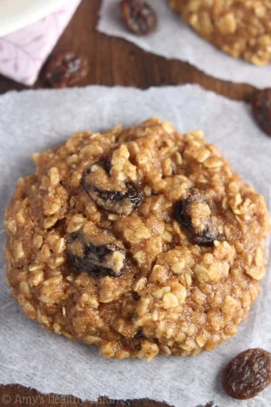 These classic cookies get upgraded with maple syrup instead of refined sugar and plenty of hearty oats. The raisins add natural sweetness and chewy texture, while oats provide fiber and whole grains. They have that familiar oatmeal cookie taste and texture everyone loves but with more nutrition.
