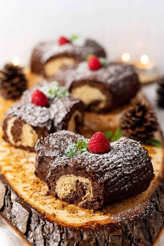 Traditional Bûche de Noël reimagined in individual servings makes for an impressive presentation. These chocolate sponge rolls filled with cream are easier than they look to assemble. The bark-like frosting is forgiving and hides any imperfections beautifully. Guests love having their own personal yule log to enjoy.