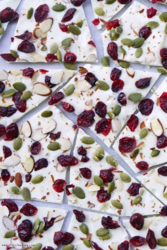This simple no-bake treat requires just minutes of active preparation time. The white chocolate provides sweetness while dried cranberries add tartness and chewy texture. Breaking it into irregular pieces gives it a rustic, homemade charm.