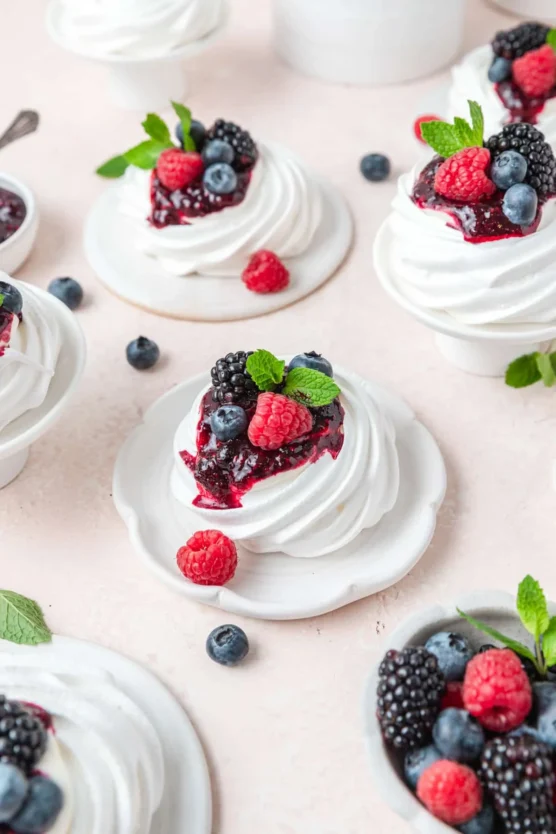 Crispy meringue shells with marshmallow-soft centers are ethereally light and elegant. Topped with whipped cream and fresh berries, they’re refreshing after heavy holiday meals. The meringues can be made ahead and stored in airtight containers for days.