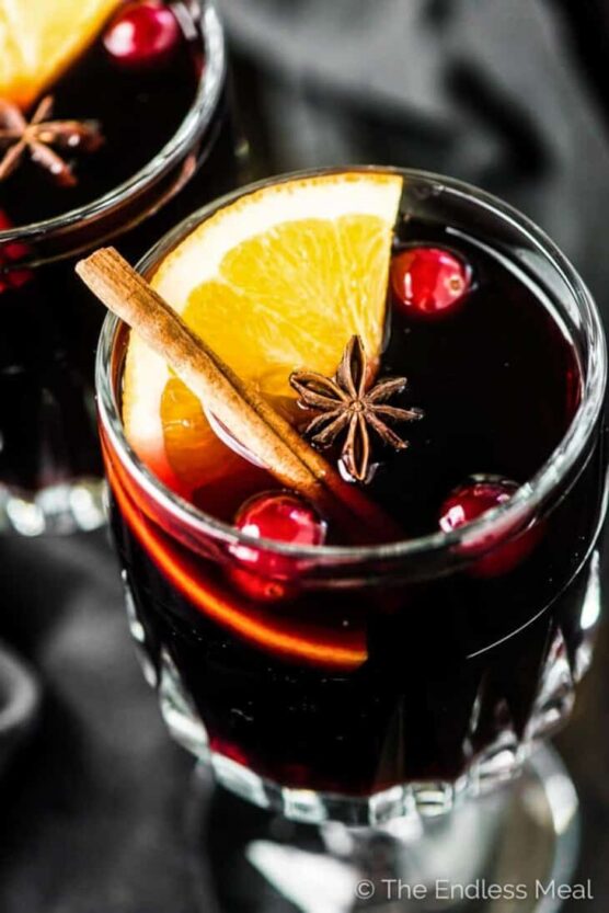 Tart cranberries and sweet apple juice turn regular mulled wine into something fruity and vibrant. The cranberries add a gorgeous ruby color and pleasant tartness that keeps the drink from being too sweet. Apple juice brings natural sweetness and makes the wine more approachable for people who aren’t big wine drinkers.