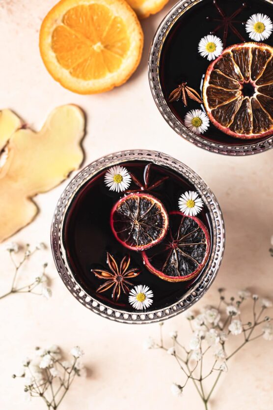 Natural honey and fresh ginger create mulled wine with a gentle sweetness and subtle spicy kick. The honey dissolves beautifully and adds floral notes that sugar can’t match, while ginger provides warmth that builds gradually rather than hitting you immediately.