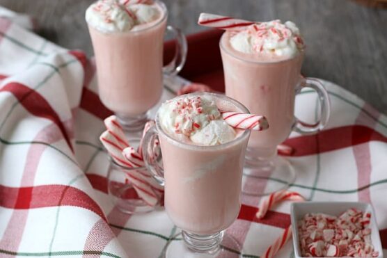 The pink color is festive and pretty, especially when served with crushed candy canes on the rim. This one is a huge hit with kids but adults love it too for its nostalgic holiday flavor.