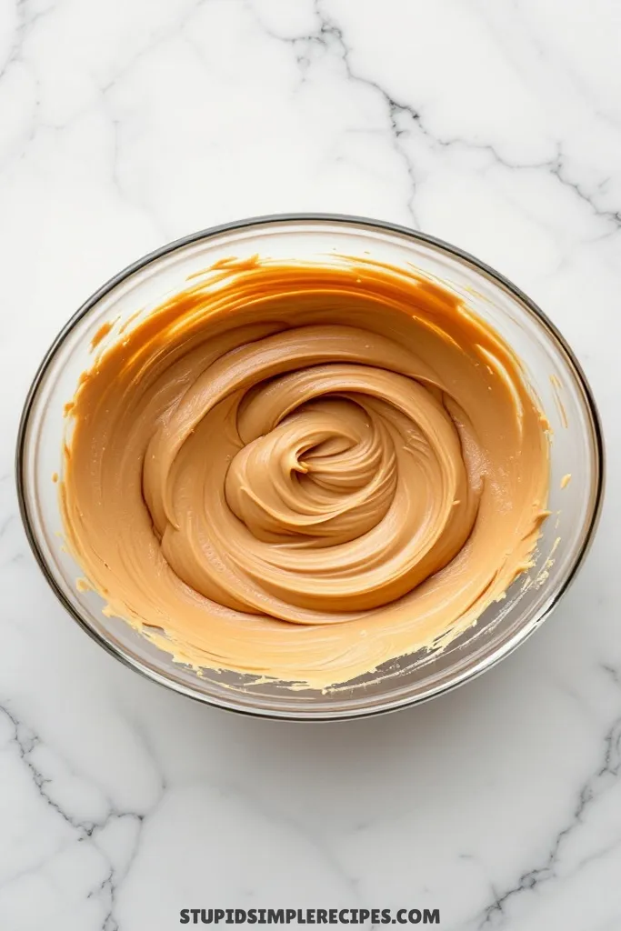 - In a large bowl, beat the softened butter and peanut butter together until they’re completely smooth and well-combined, about 2 minutes. You’ll want to scrape down the sides of the bowl at least once. Add both sugars and cream until the mixture looks light and fluffy – this usually takes about 3 minutes and the color will become noticeably lighter.