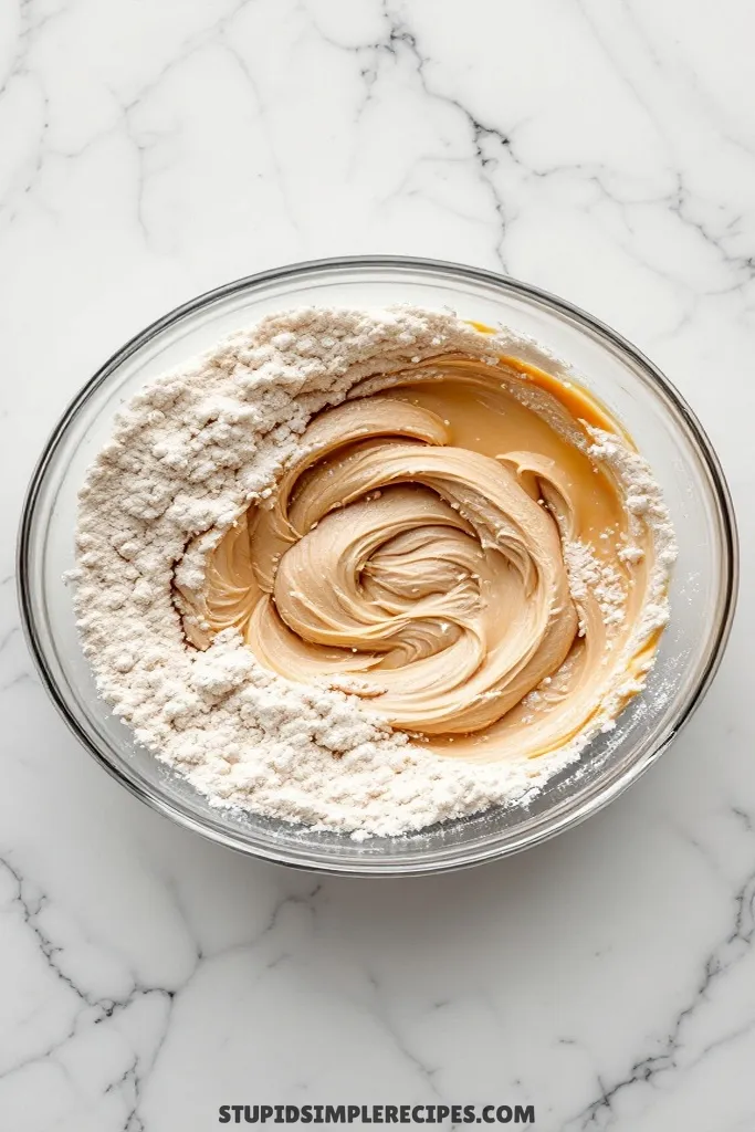 - In a separate bowl, whisk together your flour, baking powder, salt, and baking soda. Add this dry mixture to your peanut butter mixture in three portions, mixing on low speed just until you don’t see any dry flour. The dough will be pretty thick at this point.