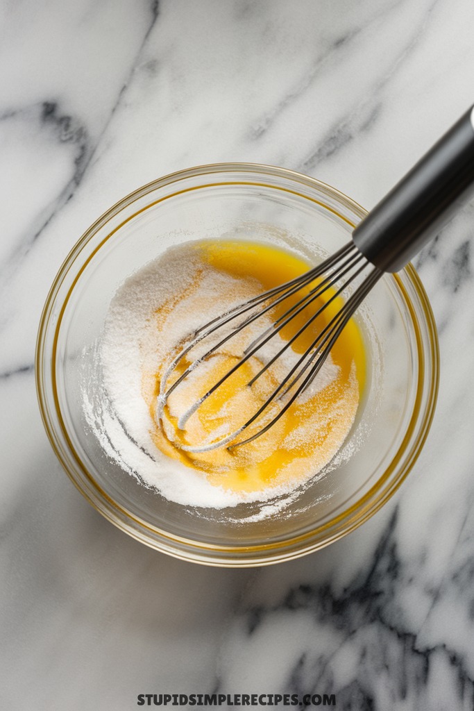 • Pour the melted butter into a large mixing bowl and add the granulated sugar. Whisk them together until well combined – the mixture will look like wet sand.