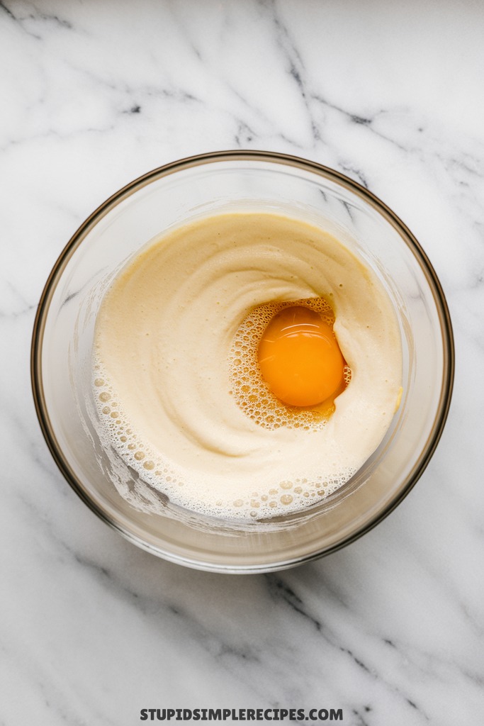 3. Add the eggs one at a time, whisking well after each addition. You want the mixture to become smooth and slightly thicker with each egg. Once all four eggs are in, add the vanilla and whisk until the mixture looks glossy – about 30 seconds.