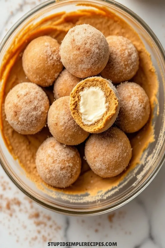 • Here’s the fun part: scoop out about 2 tablespoons of cookie dough and flatten it in your palm. Make a little indent in the center, add about 1 teaspoon of the cold cream cheese mixture, then fold the dough around it, sealing well. Roll into a ball, then coat in the cinnamon sugar mixture.