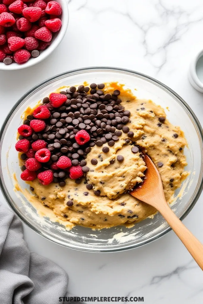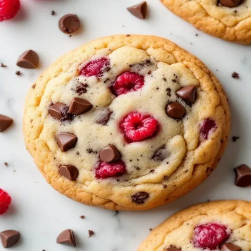Chewy chocolate chip cookies bursting with sweet, tangy raspberries for a perfect balance of rich and fruity flavors. A delicious twist on a classic favorite!