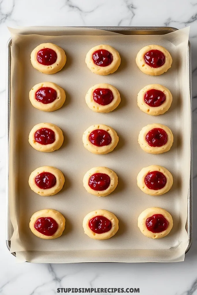 - Fill each indent with about 1/2 teaspoon of raspberry jam. Don’t overfill or it’ll bubble over while baking. I like to use a small spoon or piping bag for neat filling.